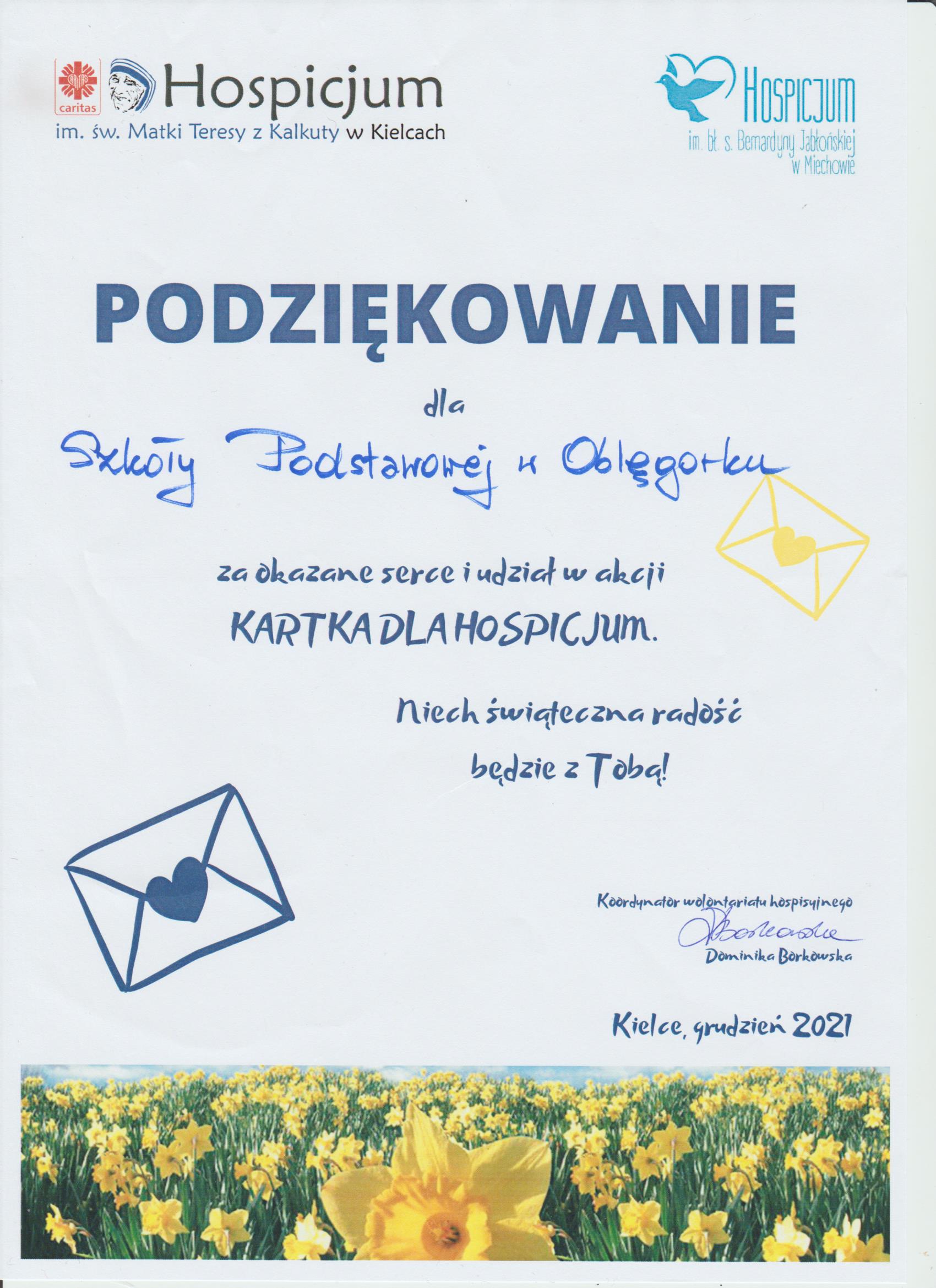 Coroczną, przedświąteczną tradycją dla uczniów z naszej szkoły staje się przygotowywanie kartek świątecznych dla pacjentów Hospicjum im. Św. Matki Teresy z Kalkuty w Kielcach.