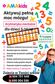 W dniu 04.09.2025 o godz. 16:00 w sali nr 13 naszej szkoły Akademia Rozwoju Intelektualnego AMAKids organizuje darmowe zajęcia pokazowe z Arytmetyki Mentalnej.
