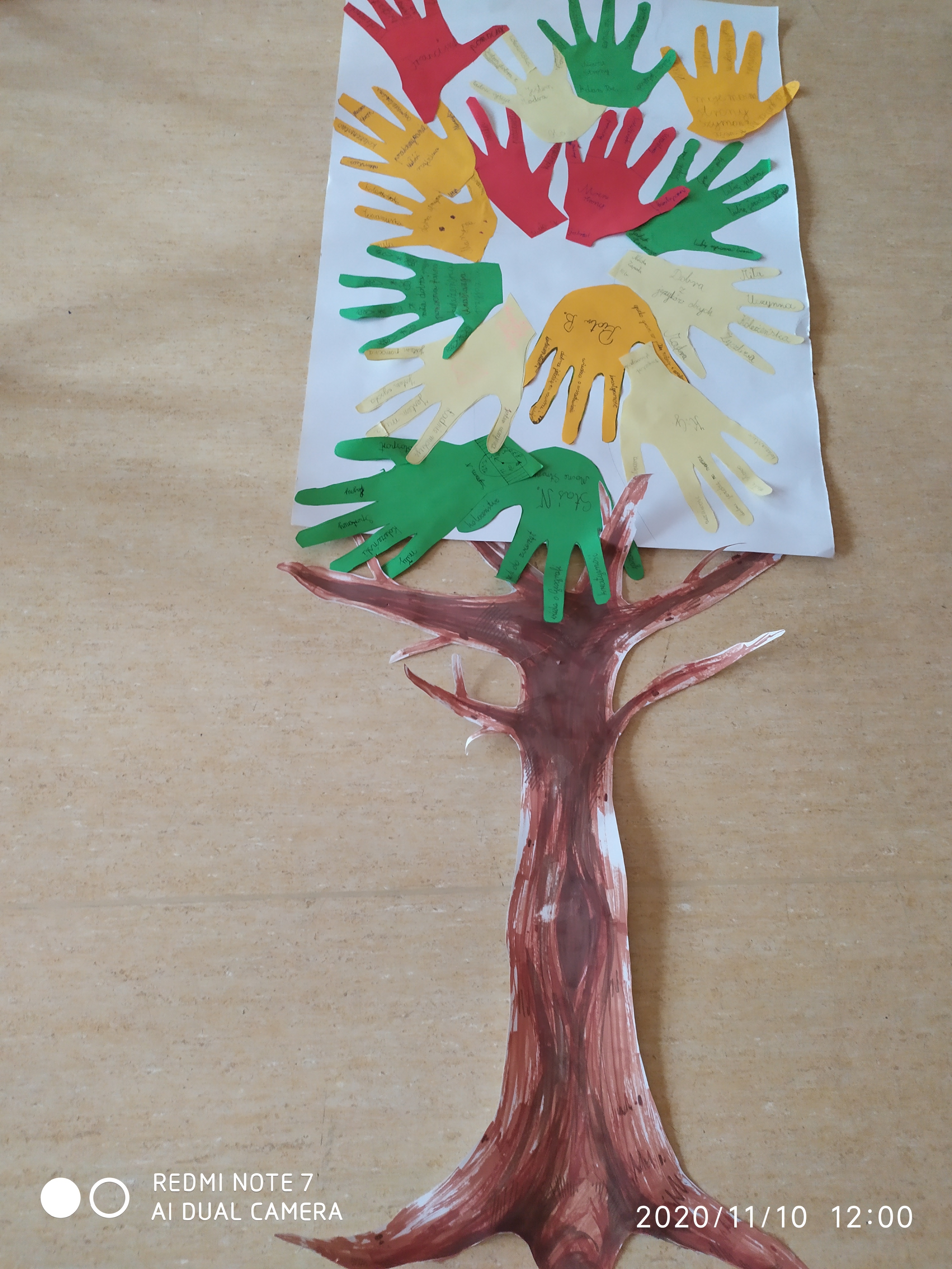 Uczniowie pracując metodą warsztatową wskazali swoje mocne strony, które zapisali na odbitych przez siebie dłoniach. Dzięki temu powstało drzewo mocnych stron uczniów klasy IIIb, które będzie przypominać o ich ogromnym potencjale.