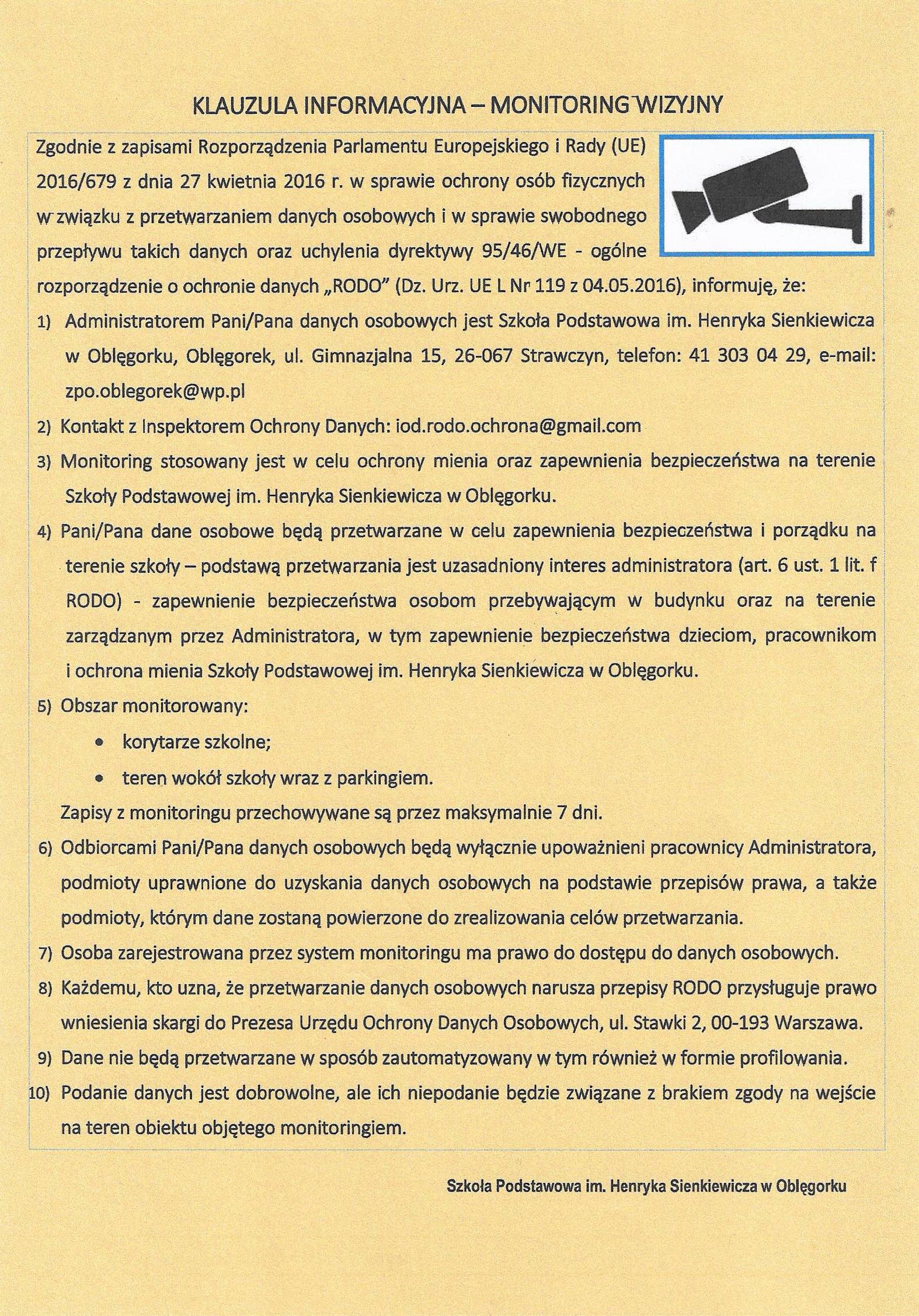 W związku z realizacją wymogów Rozporządzenia Parlamentu Europejskiego i Rady (UE) 2016/679 z dnia 27 kwietnia 2016 r. w sprawie ochrony osób fizycznych w związku z przetwarzaniem danych osobowych i w sprawie swobodnego przepływu takich danych oraz uchylenia dyrektywy 95/46/WE (ogólne rozporządzenie o ochronie danych „RODO”), informujemy o zasadach przetwarzania w Szkole Podstawowej w Oblęgorku danych osobowych oraz o przysługujących prawach z tym związanych.
